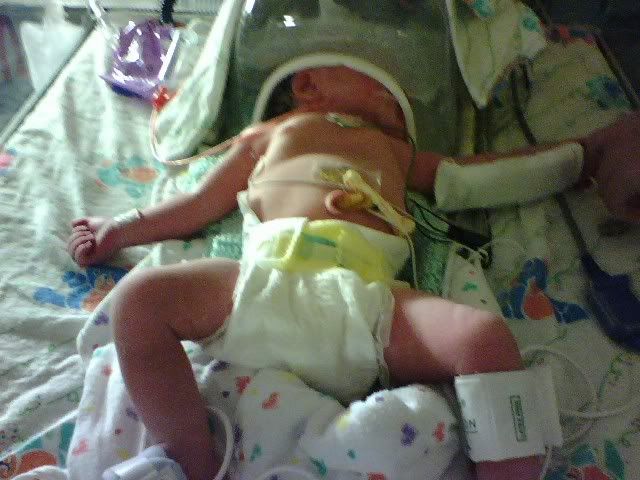 Joy's gonna hang in the ICU for a few days until she can breathe better on her own. Her face is obscured by the oxygen tent in the pic above, but she's pinking up very nicely and has a full head of hair!